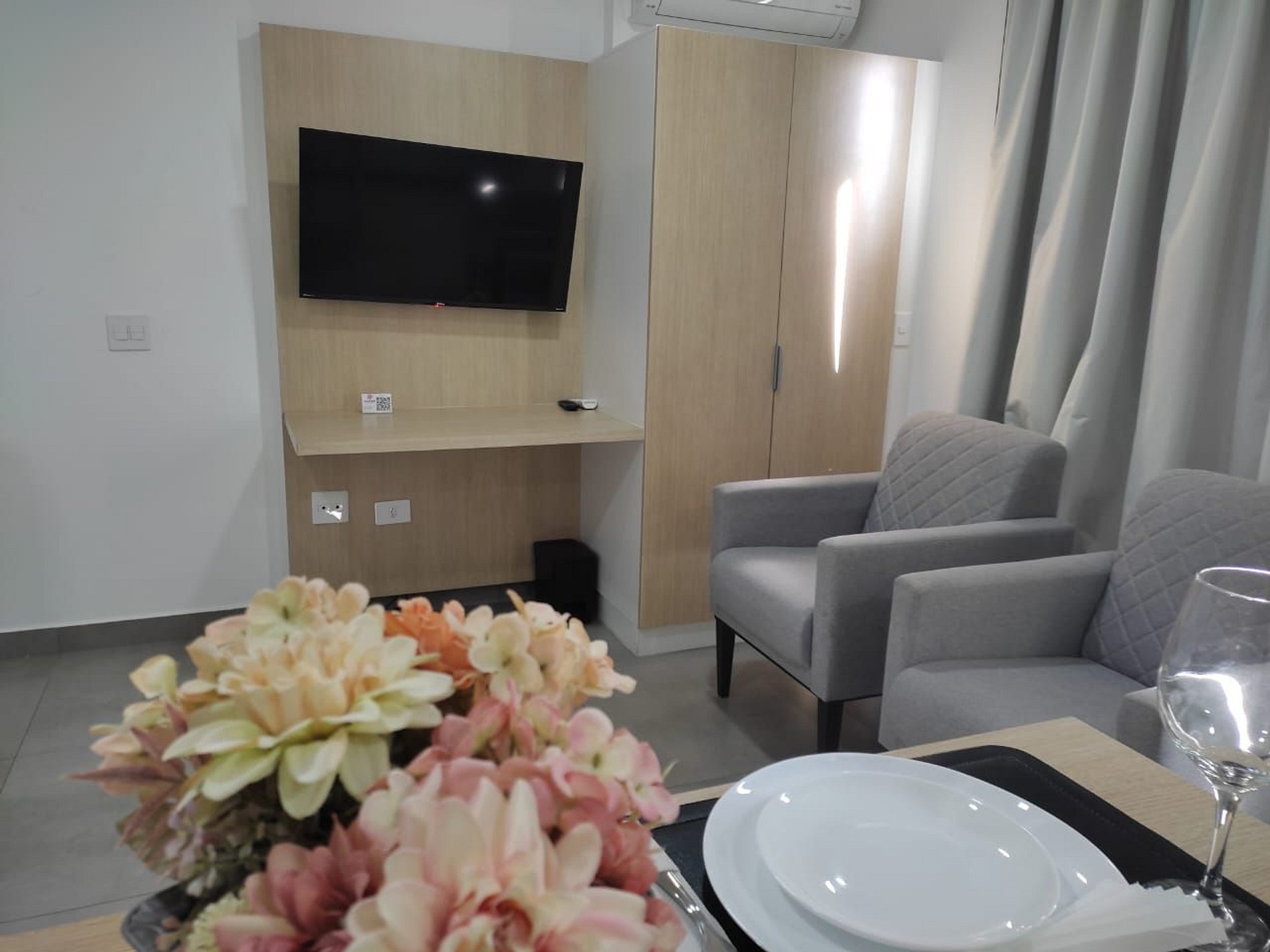- Quarto/Sala integrada: ambiente versátil com cama confortável, espaço para trabalho ou estudo e TV, perfeito para relaxar após um dia na cidade.