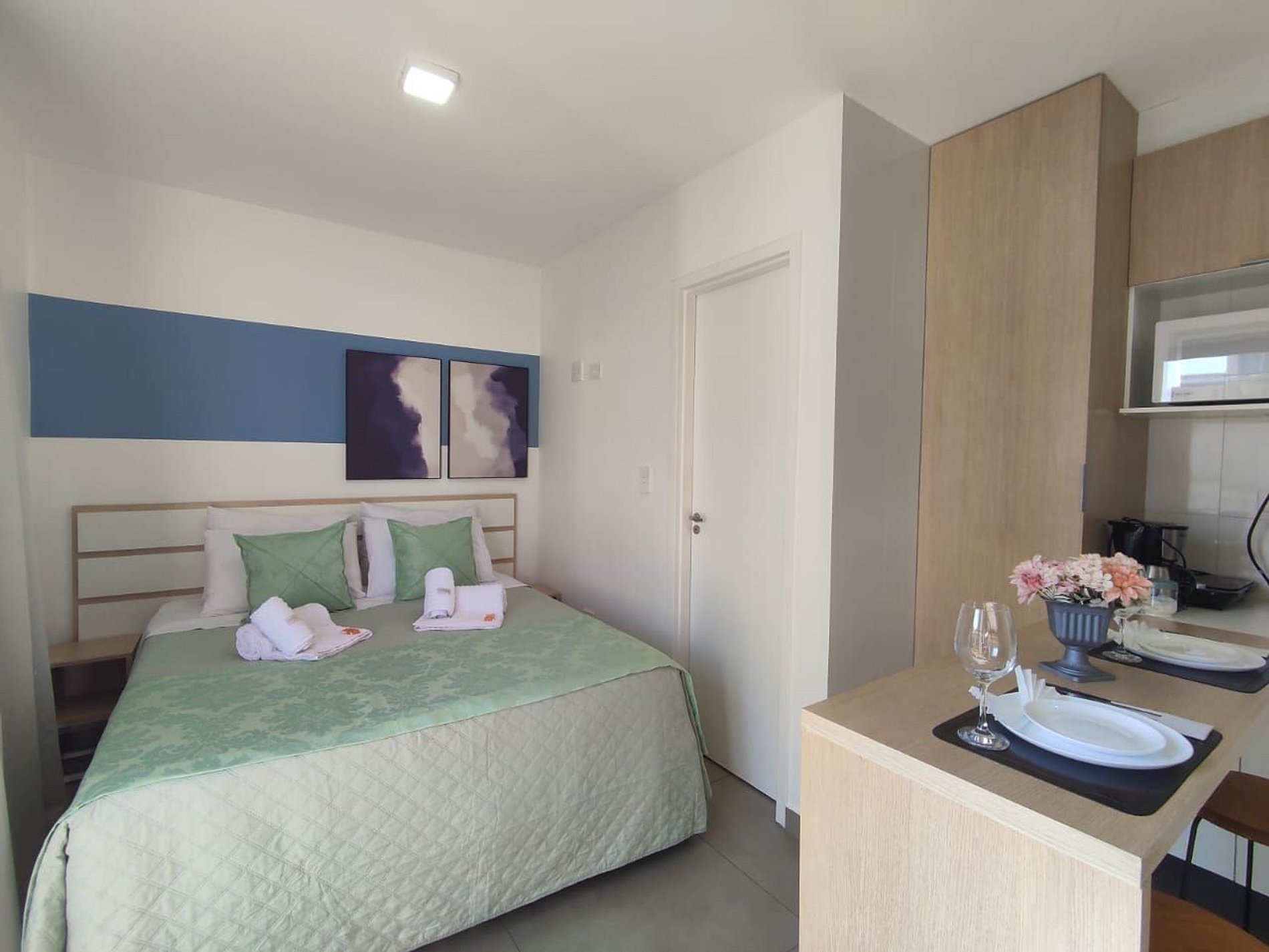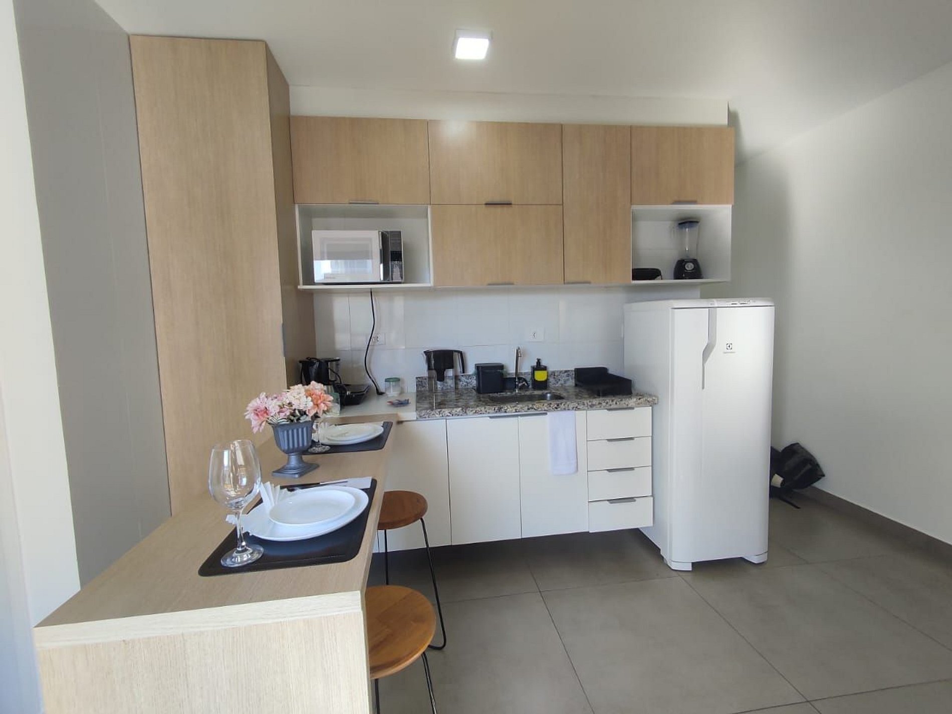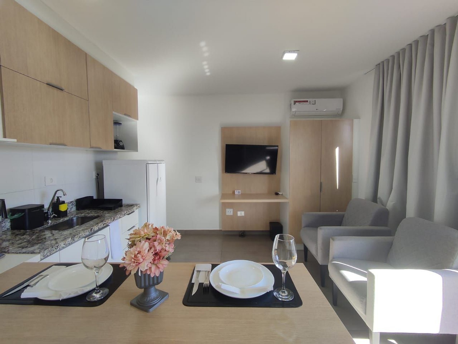 - Cozinha compacta: equipada com itens essenciais para preparar refeições rápidas, incluindo cooktop, frigobar e utensílios básicos.