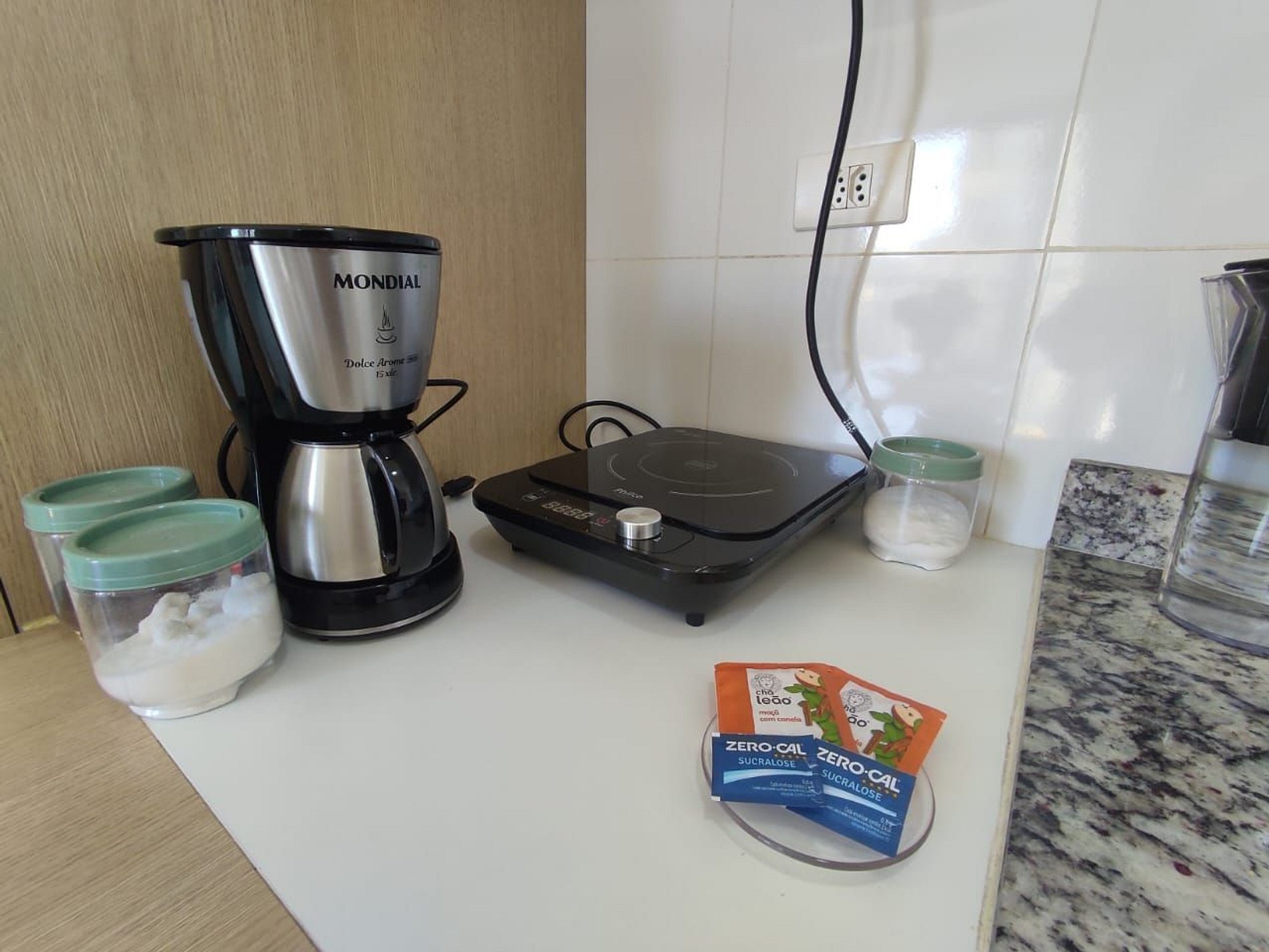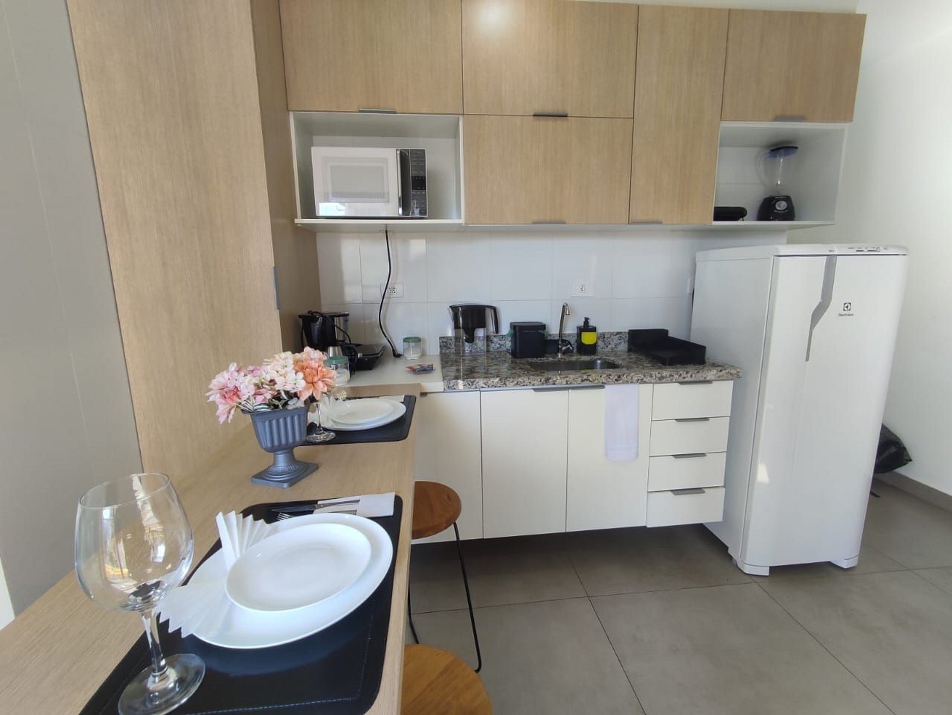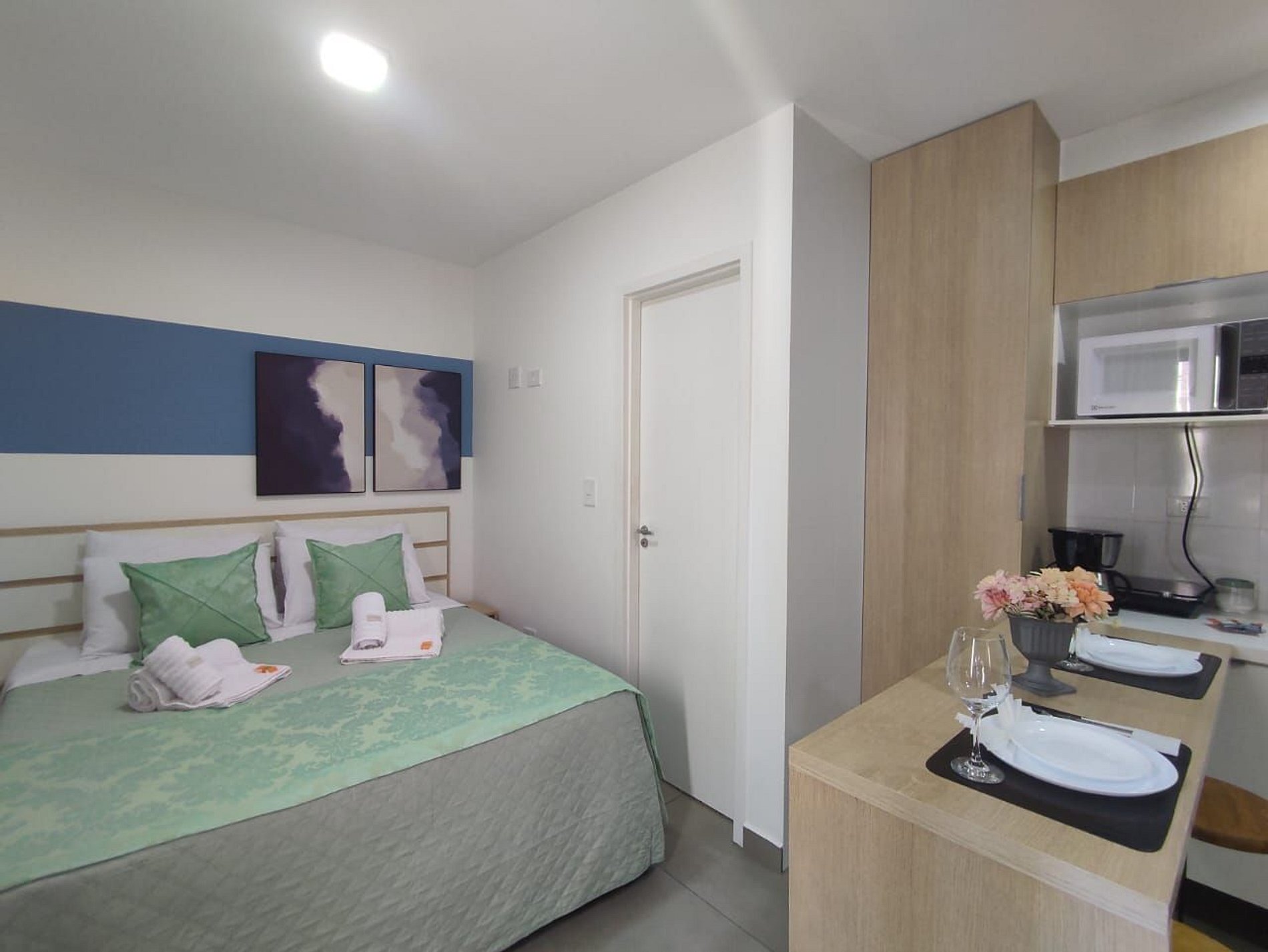 - Cozinha compacta: equipada com itens essenciais para preparar refeições rápidas, incluindo cooktop, frigobar e utensílios básicos.